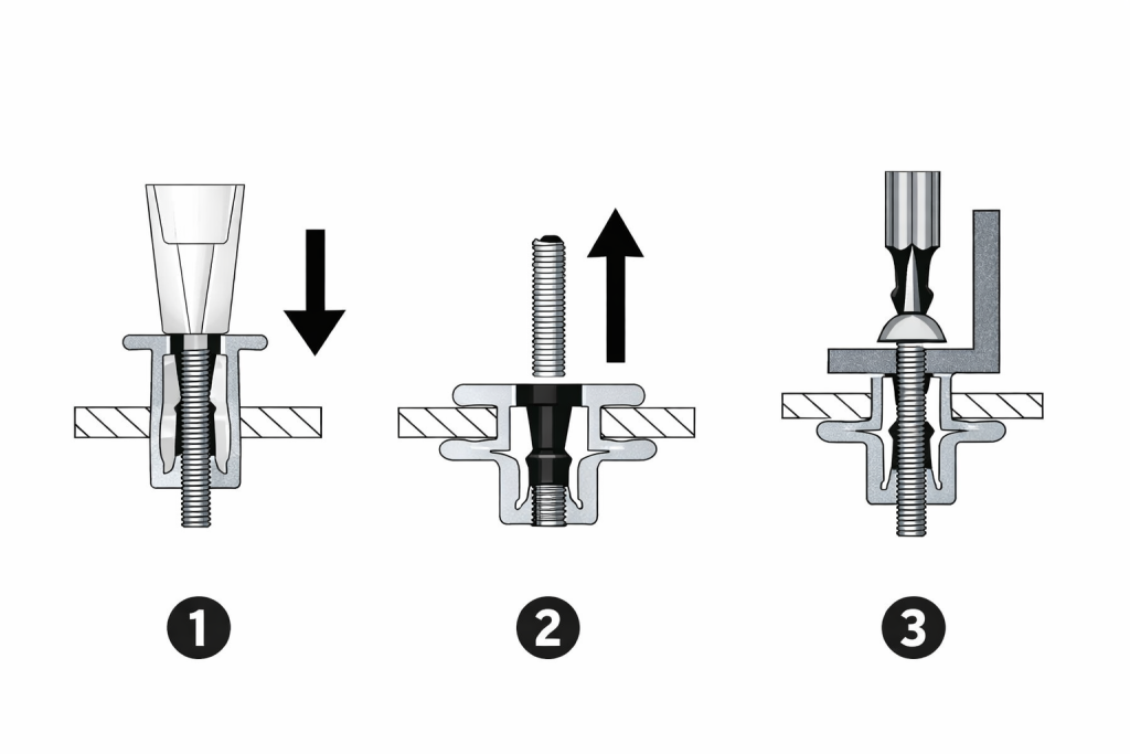 Jack nuts can be installed from one side of the panel, making them useful when the back side of the material is not accessible.
