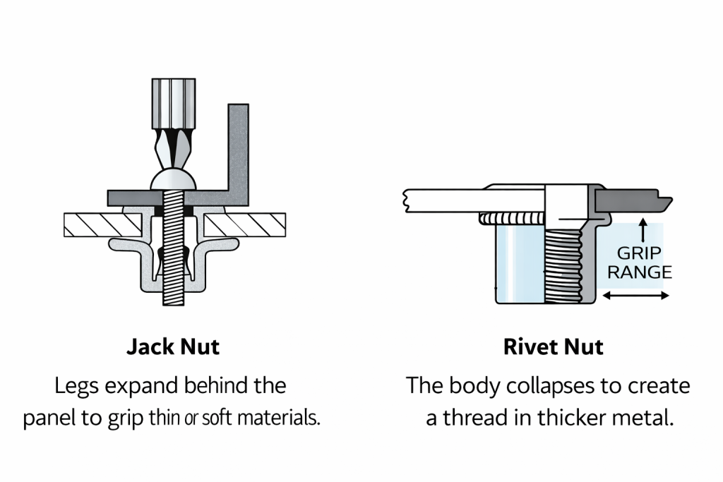 Both jack nuts and rivet nuts are blind threaded fasteners, but they are used in different situations.