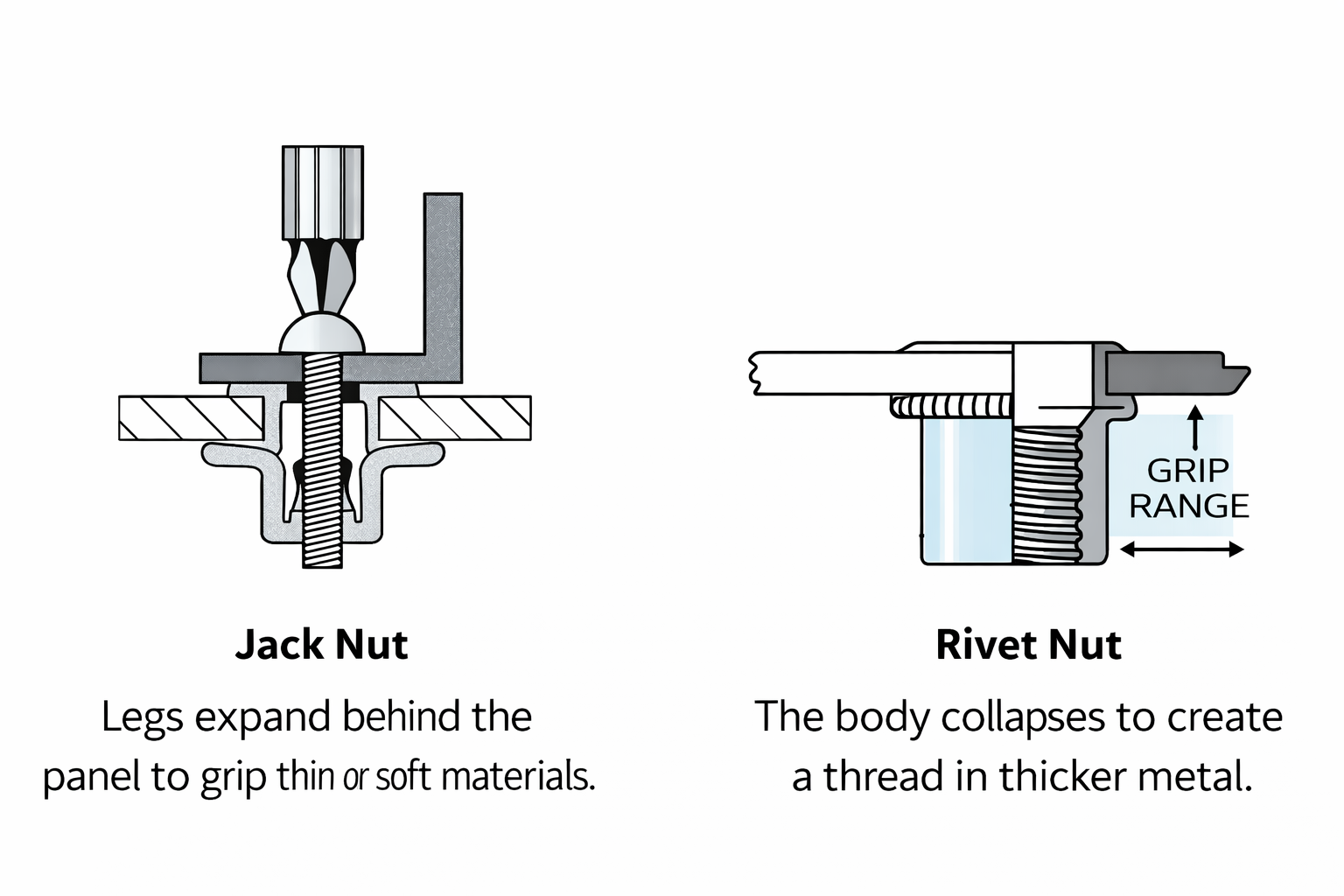 A jack nut is a blind threaded fastener designed for thin or soft materials where a standard nut cannot be installed.