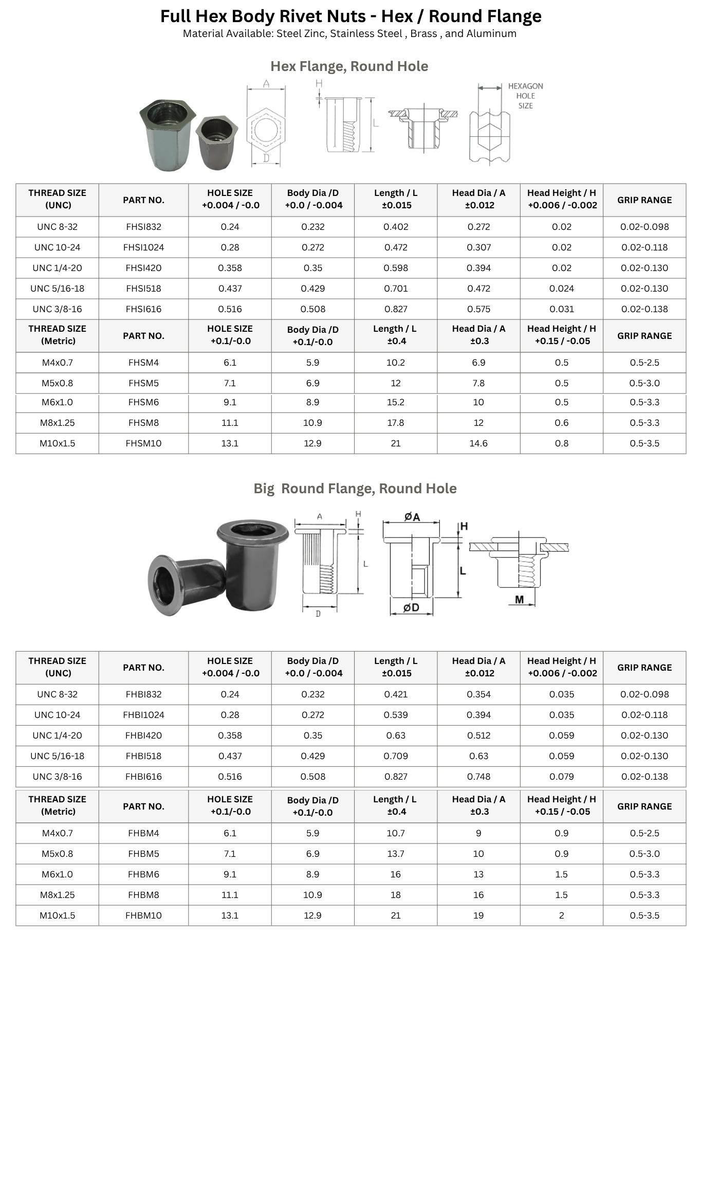 Full Hex Body Rivet Nuts, also known as hex rivet nuts, hex body rivet nuts, full hexagon rivnuts, hexagon nutserts, and hexagon rivet nut inserts, are heavy-duty threaded inserts designed with a full hexagonal body to provide superior spin resistance and high torque strength in sheet metal and structural applications.