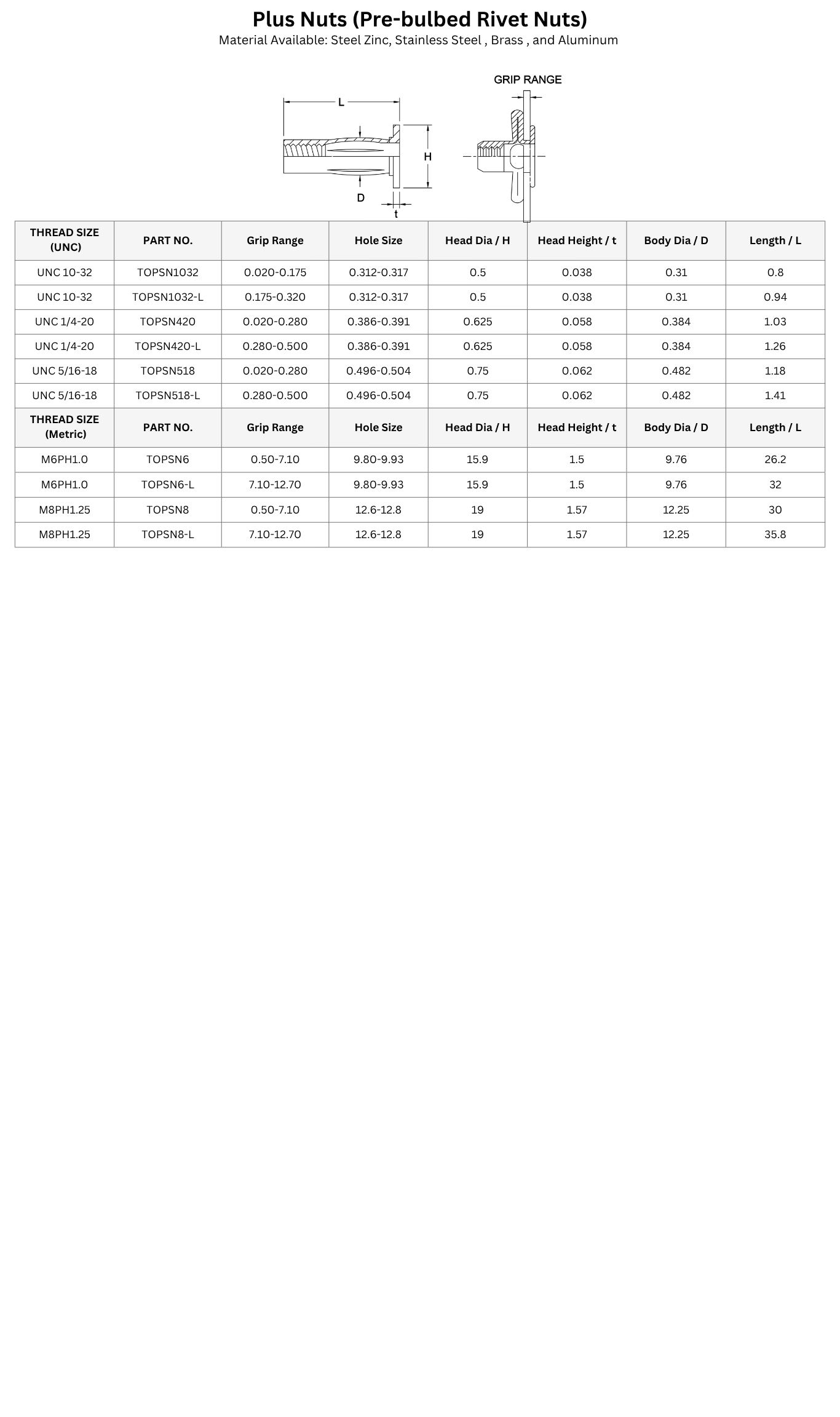 Plus Nuts—also known as Pre-Bulbed Rivet Nuts, PLUSNUT, Pre-Bulbed Plus Nuts, Slotted-Body Rivet Nuts, Bulb Rivet Nuts, Bulbed Rivet Nuts, Expansion Rivet Nuts, Expansion Nut Inserts, and Blind Expansion Nuts—are high-strength, pre-bulbed threaded inserts engineered to provide exceptional pull-out resistance and secure fastening in thin, soft, or brittle materials.