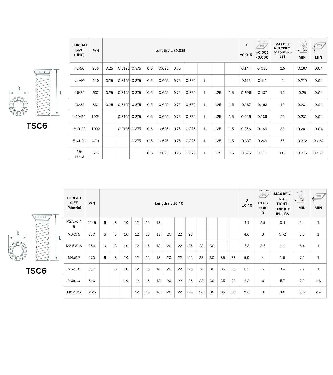 Refer to the table below for thread size, length options, and installation dimensions of TSC6 self-clinching studs.